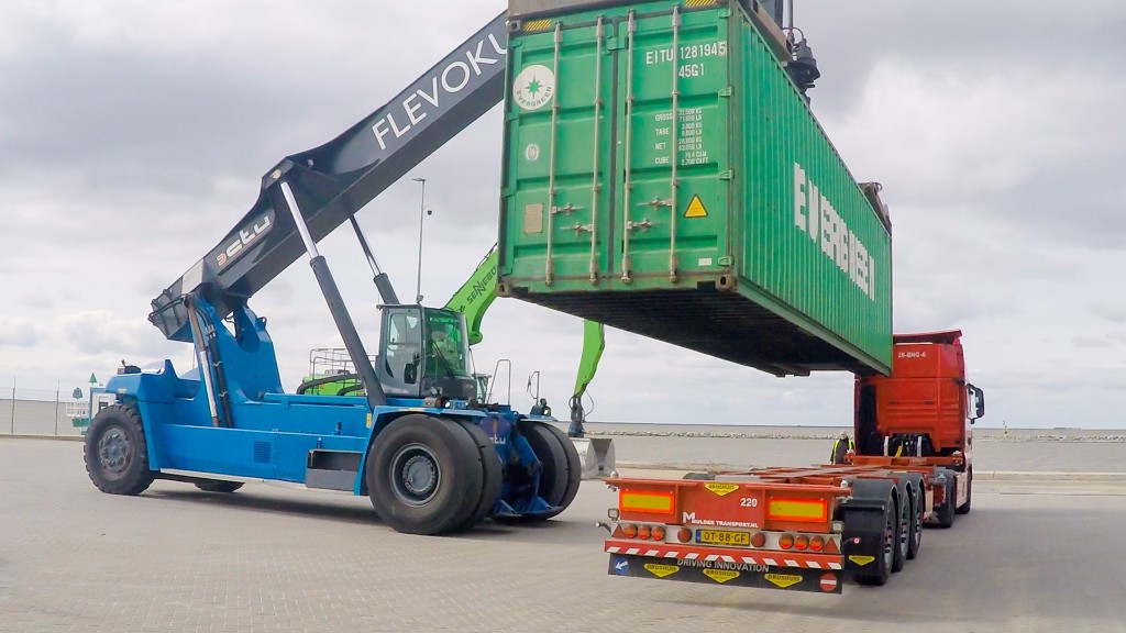 Once the chassis has been slid into position, the reach truck driver carefully places the 40FT container on the chassis. After this, the container can be fixed and the journey to Urk can start.