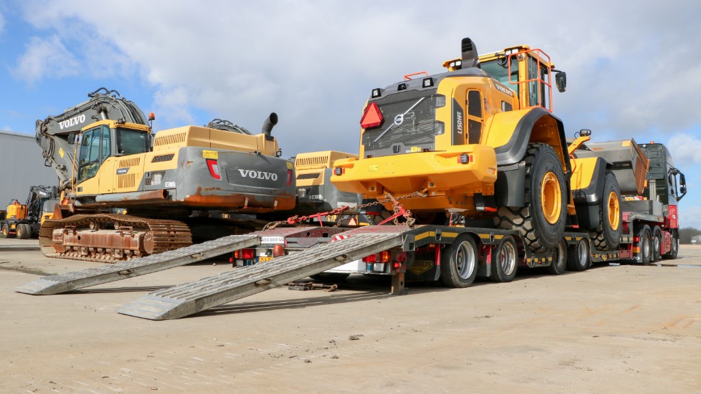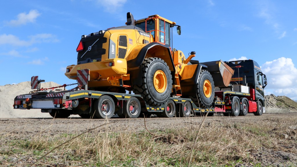 On arrival at SMT, the barrier opens by means of a remote control that Van Wieren drivers have in their car as standard. there the L150H is waiting for us shiny. On arrival, the driver must first empty the wheel wells in order to lower the tires of the shovel. This lowers the shovel and allows this transport to be transported on a semi low-loader instead of a low-loader. After the wheel wells are empty and the ramps are hooked on the back of the trailer, the driver of Van Wieren steps into the shovel to drive it on the trailer. This is where Van Wieren's service comes into play. After the machine has been loaded, the driver will start to secure the load. This clearly shows that the design has taken into account securing the various machines.