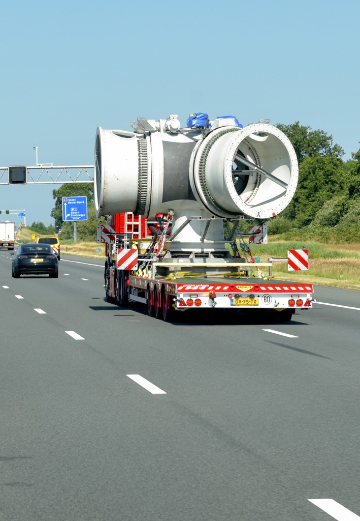 We joined one of the first transports with the new 3-axle semi low loaders: carrying a nacelle and a hub. The journey started at service company Reengineers in Barneveld, where the turbine components had been overhauled and prepared for transport. One trailer carried a nacelle measuring 5.4 metres wide and weighing 18 tonnes, while the other transported a hub measuring 4.2 metres wide and 26 tonnes. With the numerous lashing points, the load was secured firmly and safely. The combinations and the well-considered loading method clearly demonstrate why Vlastuin distinguishes itself in the market as a specialist. Thanks to the steering assistance on the rear axle, the trailers manoeuvre smoothly, even in tight spaces and sharp bends. From Barneveld, the trailer continued to Roozenberg, where the components were loaded onto a vessel for further transport to Northern Ireland.