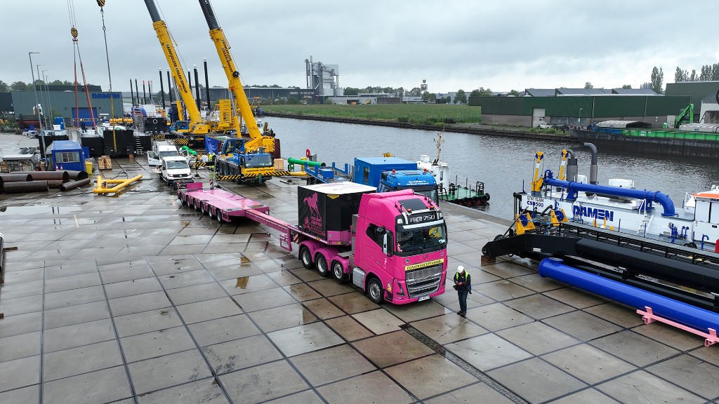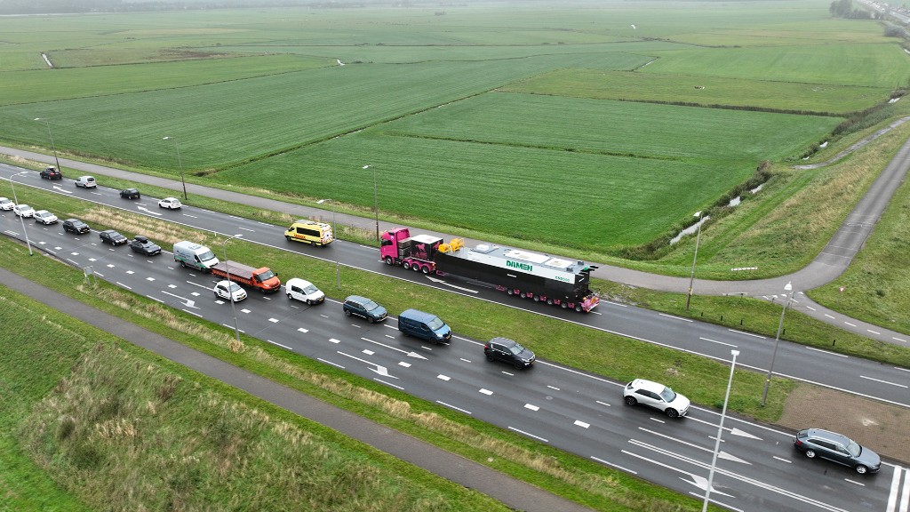 The load is a pontoon, part of the Cutter Suction Dredger CSD500, manufactured by Damen. This dredger will be used for river cleaning and is destined for an end customer in Asia via Atiz’s partner, Gürkan Transport. The journey starts at Damen in Nijkerk (Netherlands), where Yücel, alongside escort René Molenaar, prepares the trailer for loading. The pontoon measures 17.49 m in length, 3.42 m in height and 3.43 m in width. With extreme precision, a crane places the 63-tonne pontoon on the trailer, after which Yücel secures it safely and with great care.
