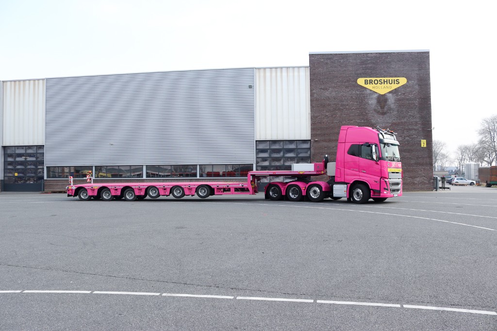 Today, we accompany Yücel Okumus, a driver for Atiz, on a transport journey. Behind the wheel of his pink Volvo and paired with a Broshuis 6-axle SL2 semi low loader, he is an eye-catching combination on the road! This trailer, featuring independent suspension, is a favourite among drivers for its stability, low loading height, and exceptional manoeuvrability. Today’s transport is the perfect demonstration of its capabilities.