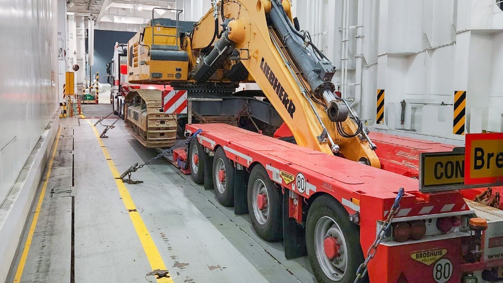 Since obtaining a German permit at short notice is not possible, the only option is to transport the entire combination by boat. With a width of 4 meters, it is a challenge to fit and measure on the boat, but thanks to the auxiliary steering, the combination is placed swiftly on board. Beginning from Gothenburg, the transport will then proceed by water to Zeebrugge, after which it will continue by road.