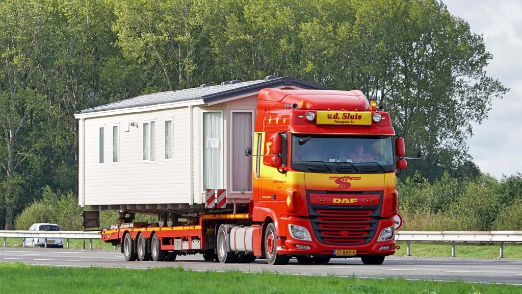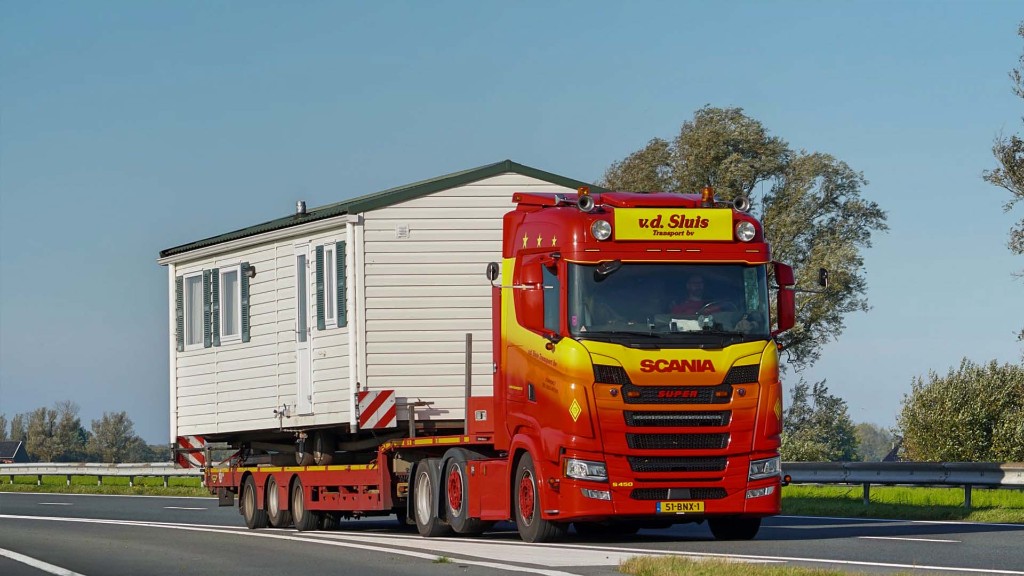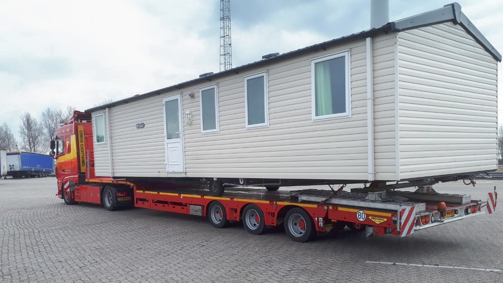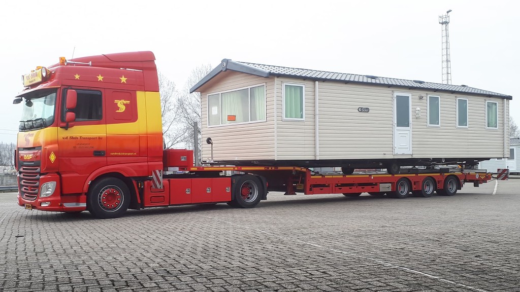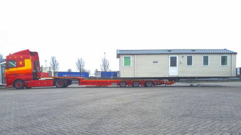 The 3-axle semi low loader with ECO ramp is used for a wide variety of loads at Van der Sluis Transport B.V. So too for the transport of mobile homes and chalets. The most critical factors in these transports are the length and height of the chalet. This semi is well-thought-out for this job!