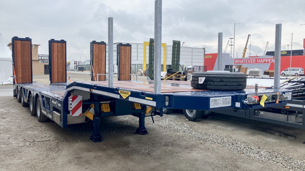 This 4-axle self tracking construction semi low loader is equipped with double wheel wells, a crane arm recess and ramps. By extending the trailer, the front wheel well can be made larger. With this you can transport almost all types of construction machines.