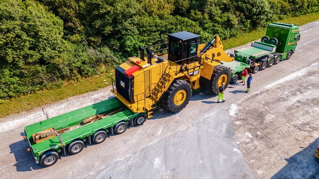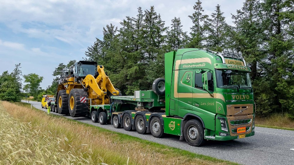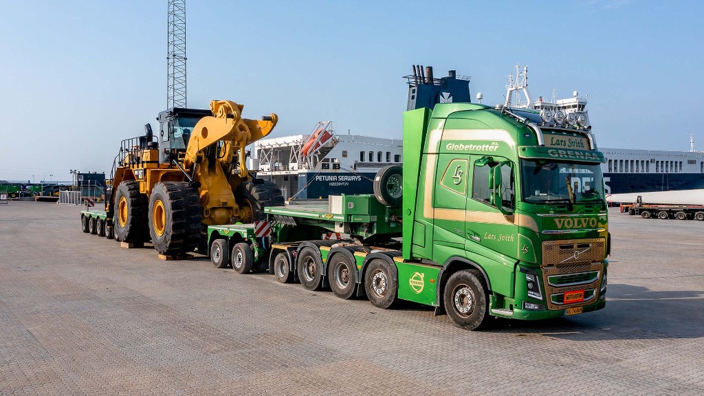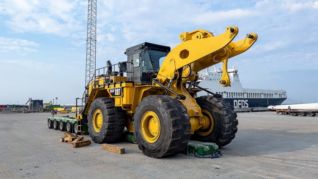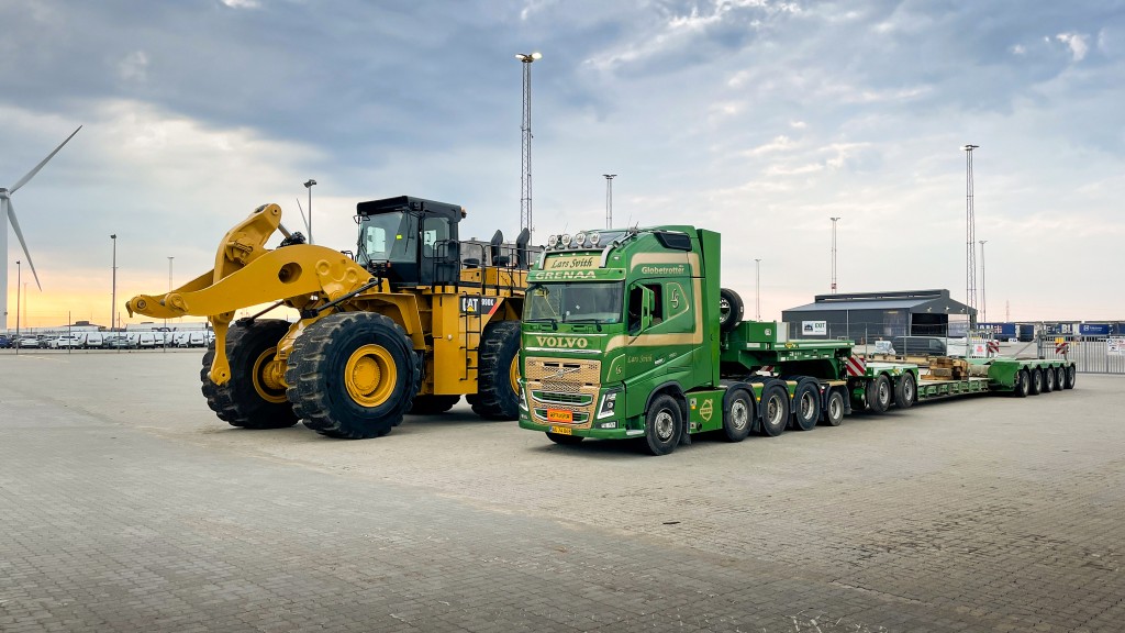 Transporting an 80-tonne Cat 990 wheel Loader 4.5 m wide and 5.4 m high from the Netherlands to Denmark is a great challenge. The first part of the journey took place by water and the later transport from Esbjerg to Aggersund Kalkværk via Løgstør by road was challenging.