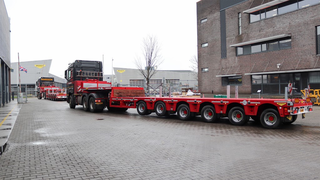 The 5-axle pendle axle semi low loaders comply with the latest Dutch legislation for the transport of crane ballast, including the ballast exemption up to 100 tonnes. Moreover, the trailers are designed to transport crane ballast and boom sections on the low loader without extending, while the combination with Mammoet’s 6×4 tractor units remains within the maximum permitted vehicle length of 16.5 metres.