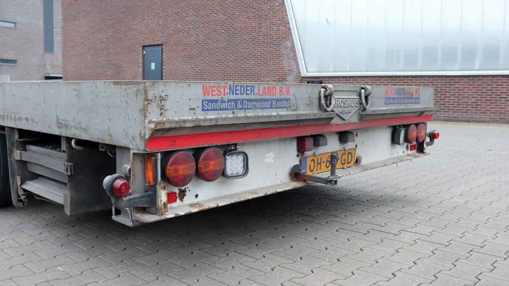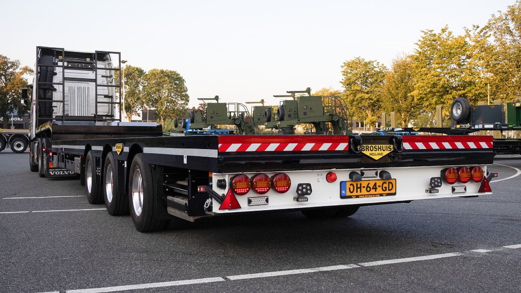 This 3-axle hydraulically steered semi low loader is single extendable. Thanks to the hydraulic steering, the trailer follows the truck very accurately. Because of the axle spacings, this trailer is plated for 10 tonnes per axle.