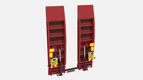 The extra long ramp can be supplied in an extra wide variant, which is 1250 mm wide. The ramps are installed across the full width of the cargo bed, making it easy for three-wheelers and vehicles with different track widths such as asphalt milling machines to drive on and off as well. This extra wide variant of the extra long ramps offers the solution for very many types of cargo, but unfortunately not for cargoes that require a boom well. A boom well cannot fit between the ramps, meaning that you will need to drive with them extended.