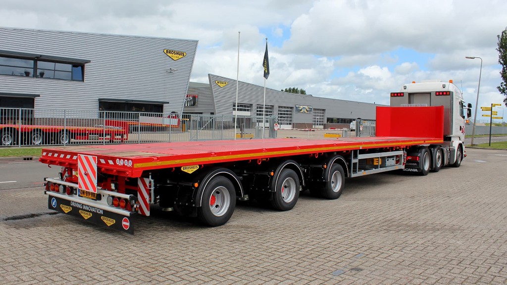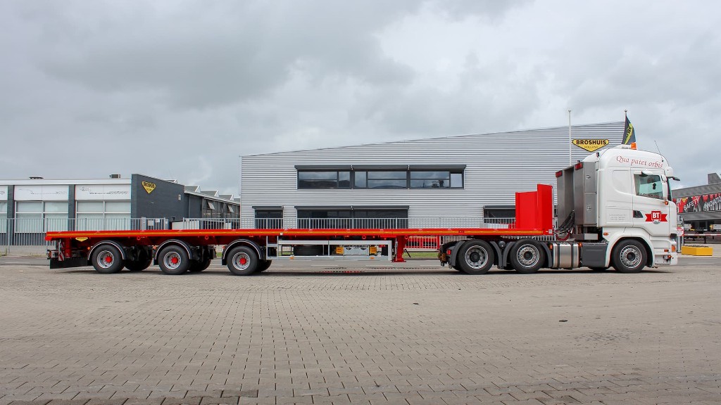 With a double extendable flat trailer you have a trailer of up to almost 30 meters in length, despite the slight increase in the tare weight.Double extendable flat trailer, hydraulically steered, 245 tires