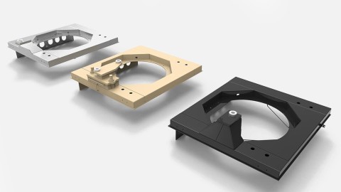 The image shows the lacquering process step by step, in which the left-hand turntable is scooped, the middle one is primed and the right one is coated with 2-K lacquer.