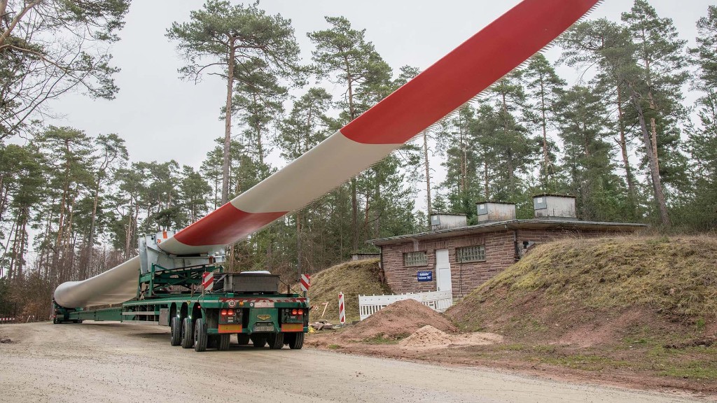 The four times extendable pendle axle blade trailer has been one of the latest innovative developments. This flat trailer can reach a length of up to 69 m and has been specially developed for transporting the blades (wings) for wind turbines. The hydraulically lifted gooseneck, together with the high stroke of the pendle axles, gives the blade trailer the advantage that the trailer can easily get over and around obstacles.