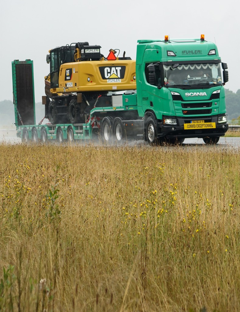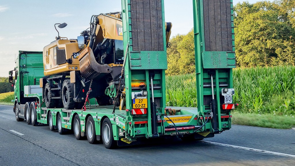 The 5-axle hydraulically steered construction semi low loader is versatile, thanks to the ramps, crane arm recess and wheel wells. Thanks to its robust construction, this trailer has a long service life.5-axle hydraulically steered construction semi low loader with ramps