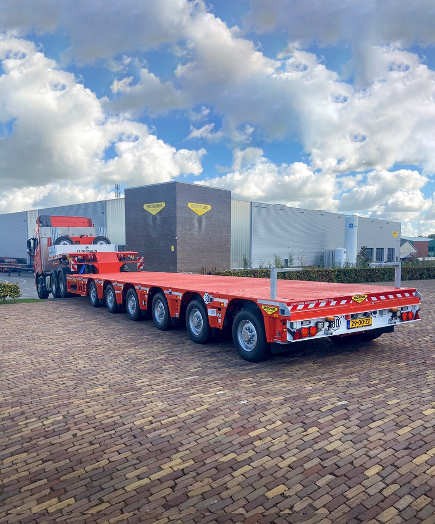 Transporting high and heavy loads is simplified with our 6-axle pendle axle semi low loader. Our 6-axle pendle axle semi low loader has many advantages and allows you to stand out from the competition. With a 600 mm stroke, you can self-jack loads and manoeuvre in confined, off-road areas. Thanks to the hydraulic gooseneck, you can create a lot of ground clearance. This 6-axle pendle axle semi low loader is extendable to a length of 22.5 metres. Thanks to our latest production technologies, we know exactly where to reinforce the pendle axle semi low loaders and where weight can be reduced. As a result, our pendle axle semi low loaders are lighter and have a lower ride height.