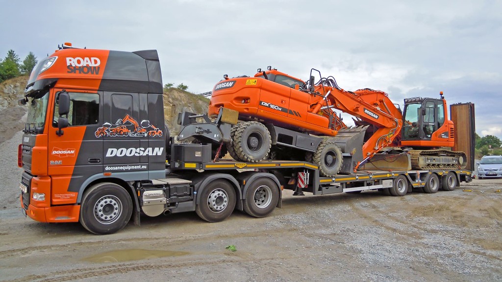 This semi low loader with ramps makes loading, unloading and transporting tracked and wheeled vehicles much easier. Thanks to the wheel wells and crane arm recess, you can reduce the overall transport height.3-Axle, self-tracking construction semi low loader with ramps