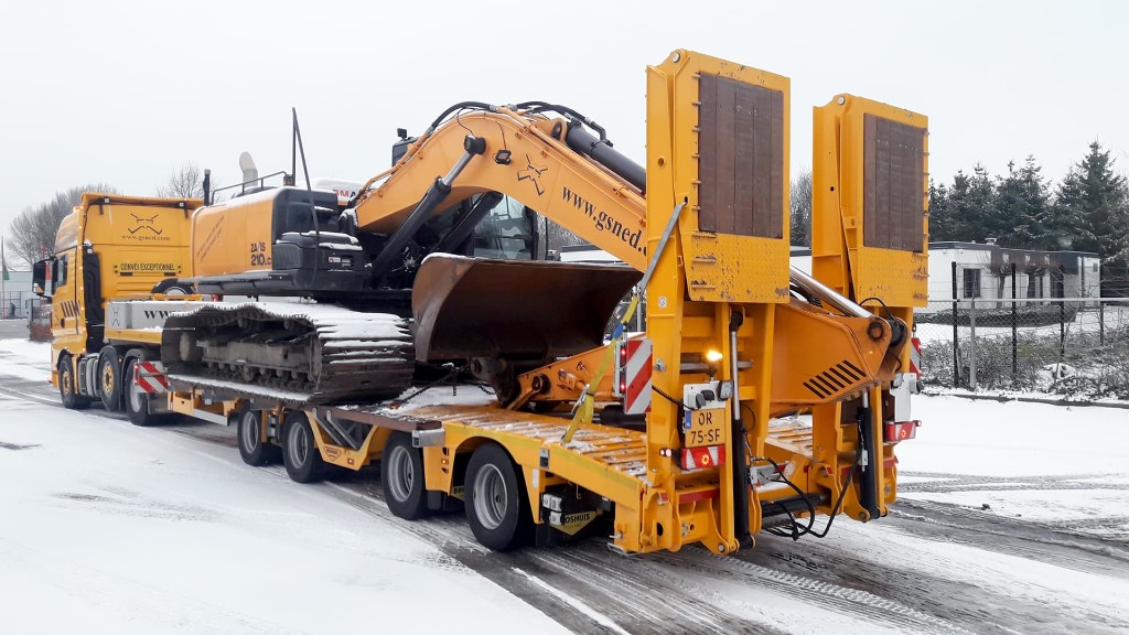 With this semi low loader, transporting tracked and wheeled vehicles becomes much safer and easier. Thanks to the wheel wells and crane arm recess, you can reduce the overall transport height.4-Axle self-tracking construction semi low loader with ramps