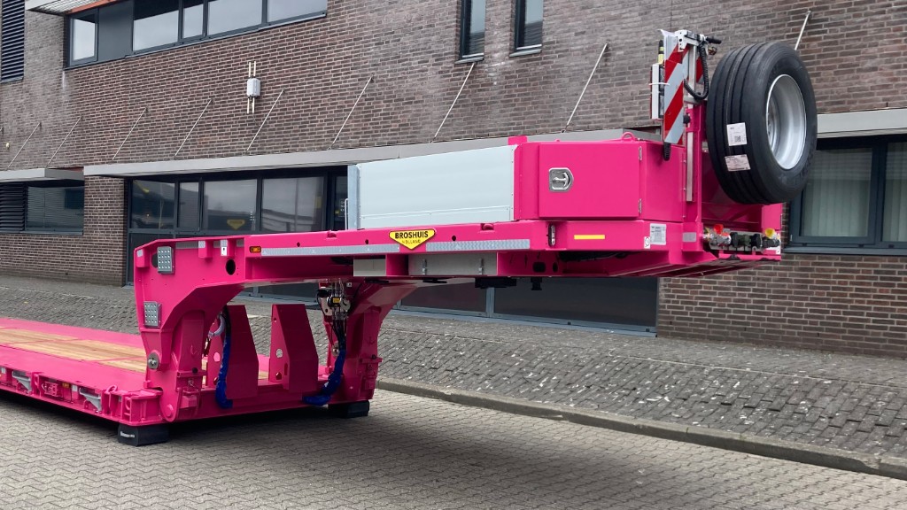 This hydraulic neck with integrated 1-axle dolly has a maximum allowable fifth wheel load of 25 t and is applied to our 1 + 3, 1 + 4 and 1 + 5 axle dolly low loader combinations. This dolly is an additional fixed axle between the gooseneck and provides better weight distribution of the load. You can choose to link this neck with a dolly to a two beam bed (outer girder) or a central beam bed. The neck has a section and certified lashing rings, allowing loading on the neck. As standard, the neck has a 3.5" kingpin.
